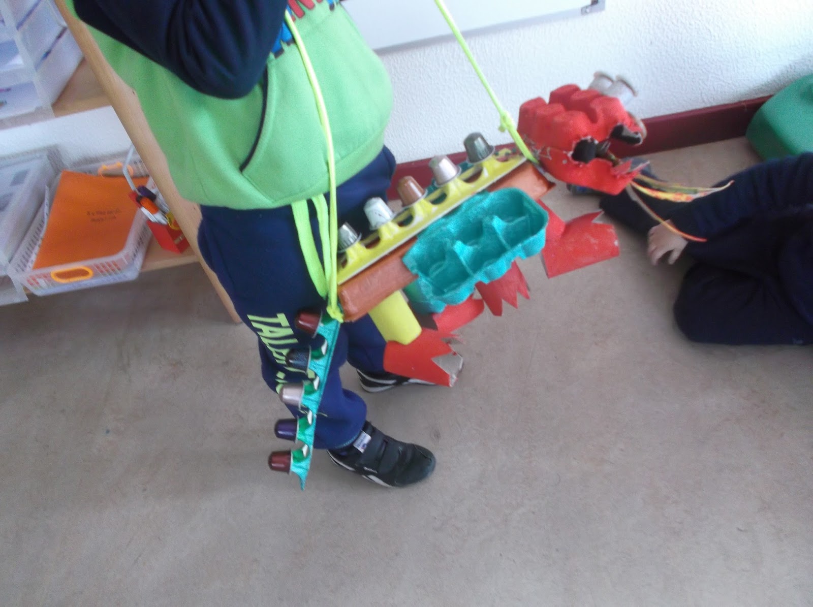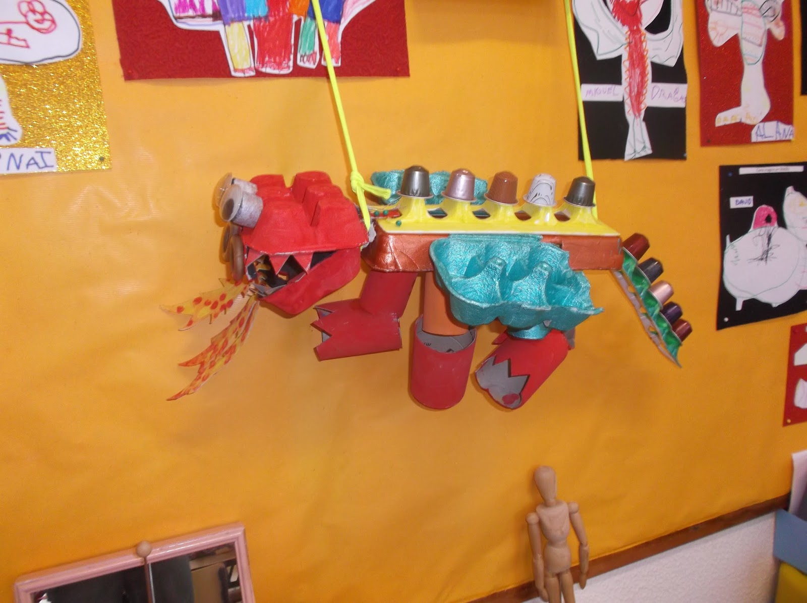Juntamos caixas de ovos e outros materiais para reutilizarmos. Tentamos sempre que possível poupar o ambiente e reduzir a nossa pegada ecológica, reaproveitando materiais diversos. Partimos para a elaboração de um dragão para brincarmos na sala e outros individuais como formas animadas.