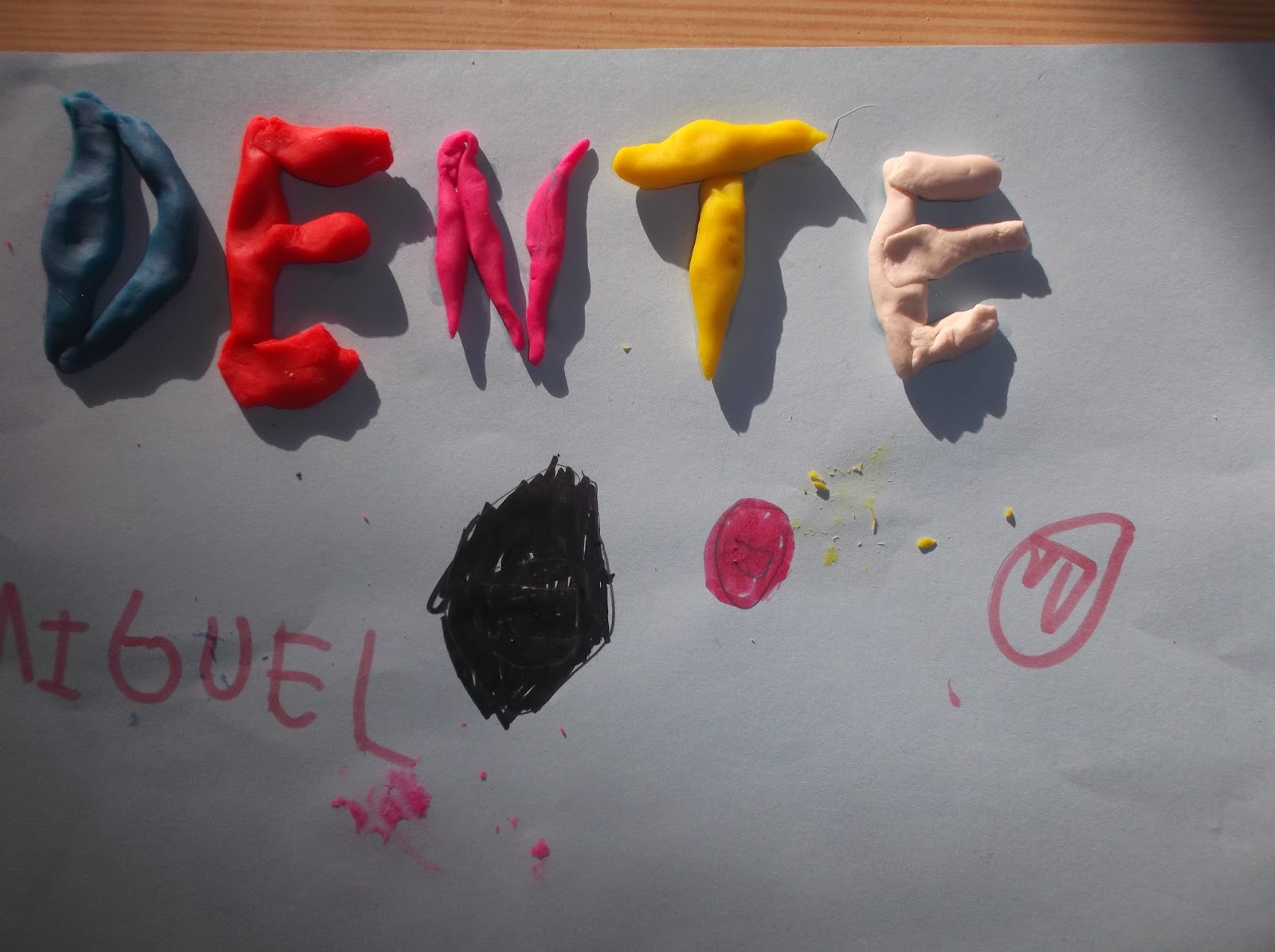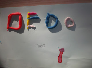 Descobrimos palavras que rimam com DRAGÃO e construímos uma pequena história em banda desenhada. Pensamos em palavras que começam com o som "D" como em DRAGÃO e descobrimos a palavra DENTES, DEDOS, e o nome do amigo DANIEL entre outras. Modelamos essas palavras com plasticina.