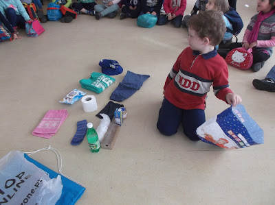 A partilha foi muito rica. Alguns objetos eram comuns em várias mochilas, tais como: brinquedos, água, bolachas, roupa, cartões de identificação, livros,...outras mochilas traziam objetos mais específicos como colete salva vidas, kit para diabetes, termómetro, papel higiénico, óculos de Sol, escova e pasta de dentes, apitos, mantas, fotografias da família, cachecol entre outros.