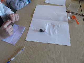 Fomos procurar um caracol vivo e colocámo-lo junto a um papel seco de um lado e molhado do outro. O caracol teria que escolher o caminho que mais lhe agradasse.