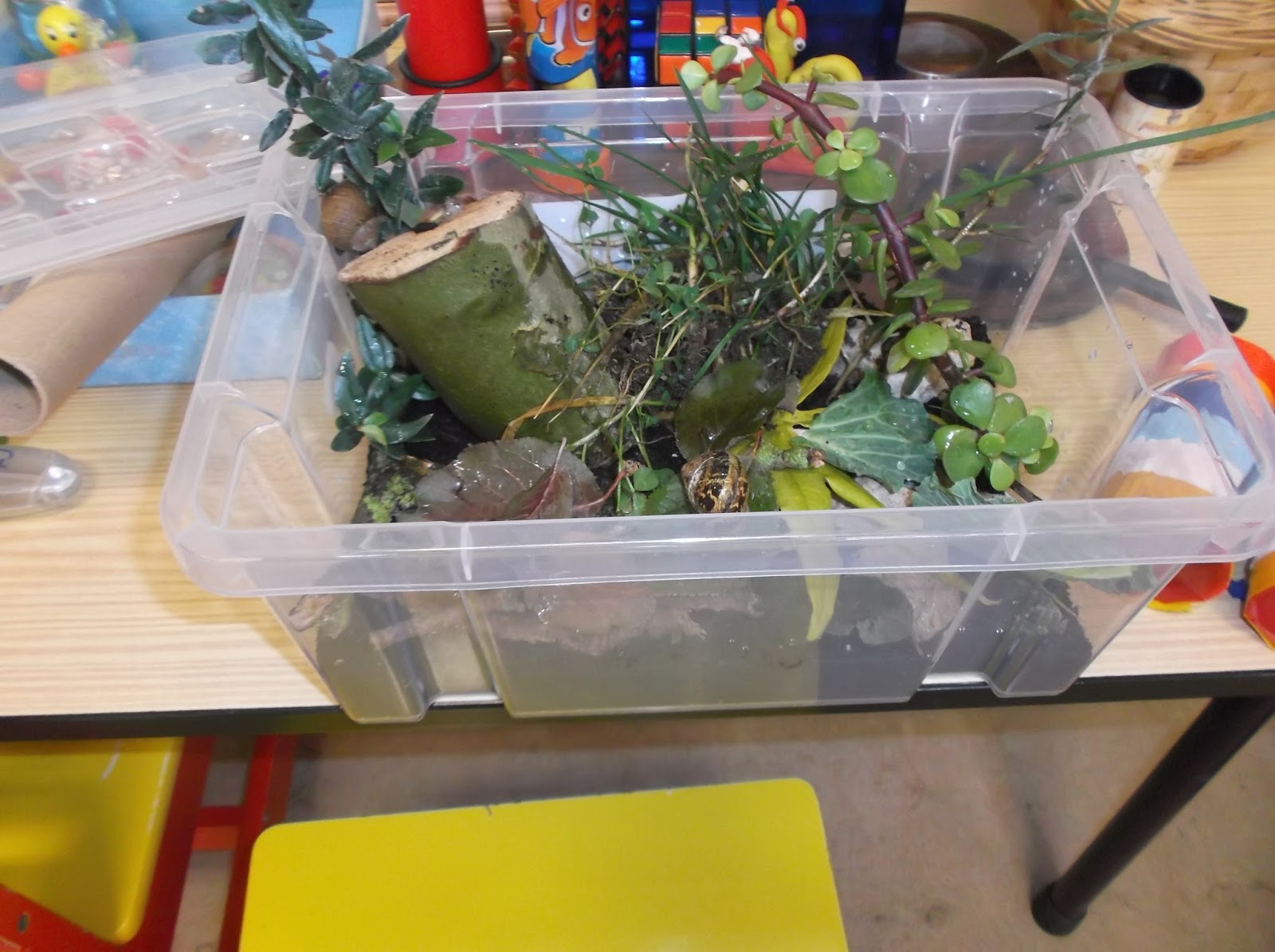 O entusiasmo com os caracóis foi tão grande que a sala já tinha caracóis por todo o lado. Então resolvemos fazer um caracolário para podermos observar os caracóis e brincar com eles de vez em quando.